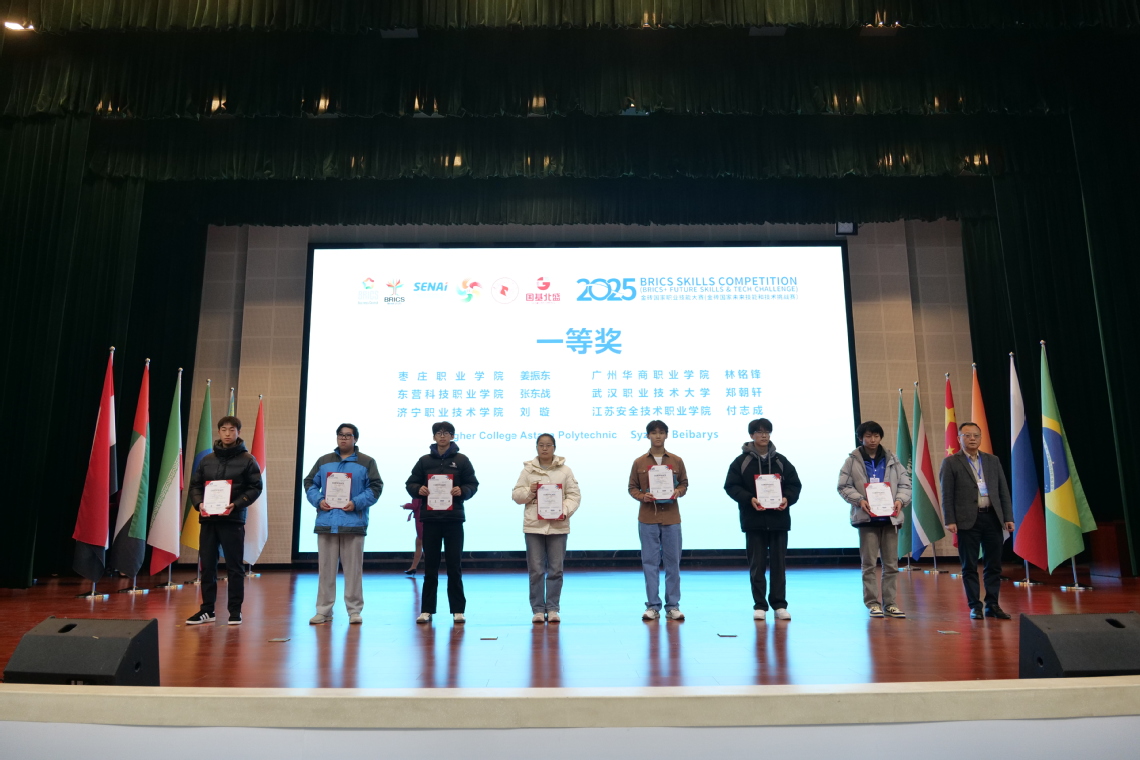 新闻网讯(通讯员吴颖) 12月7日,2025年金砖国家职业技能大赛(金砖国家未来技能和技术挑战赛)人工智能技术应用赛项总决赛在山东枣庄职业学院圆满落幕。武汉职业技术大学人工智能学院(信创产业学院)网络23302班郑朝轩凭借出色表现,从来自全国以及巴西、俄罗斯、哈萨克斯坦等国家和地区的90余名选手中脱颖而出,荣获该赛项一等奖,指导教师江岚获评“优秀指导专家”。
