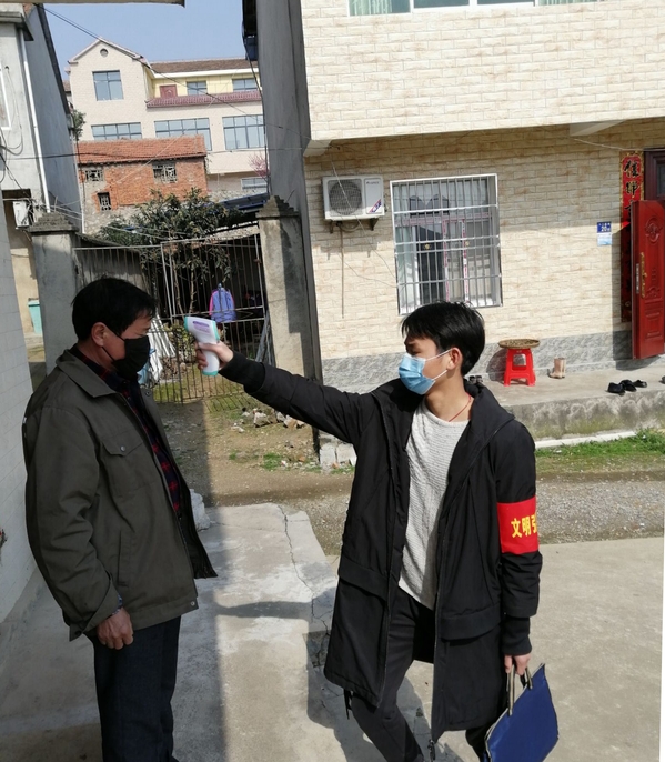 罗品超每天八点多到村委会办公室,协助村委会工作人员采购村民所需药品。随后,骑着电动车挨家挨户敲响村民的家门,不厌其烦地登记体温,宣传防疫知识,布正司湾、李家铺……村里的每一个小队,都留下了他的脚印。他说:“虽然工作量大,身体疲惫,但心里是充实的。有时去村民家做登记,没有条件伏案记录,只好将登记表放在腿上填写信息;有时遇到村民热情相待,递给你一杯水或者两个砂糖橘,这些暖心的举动让我觉得有无数人正在用自己的方式对这次疫情防控给予支持。”