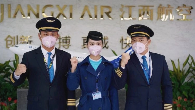 谢甜甜(左二)与江西航空公司乘务员一起为湖北加油