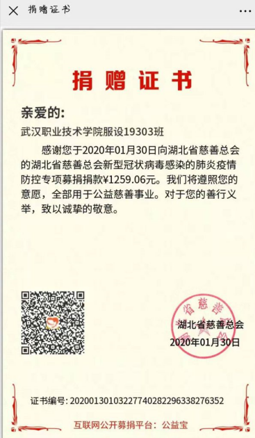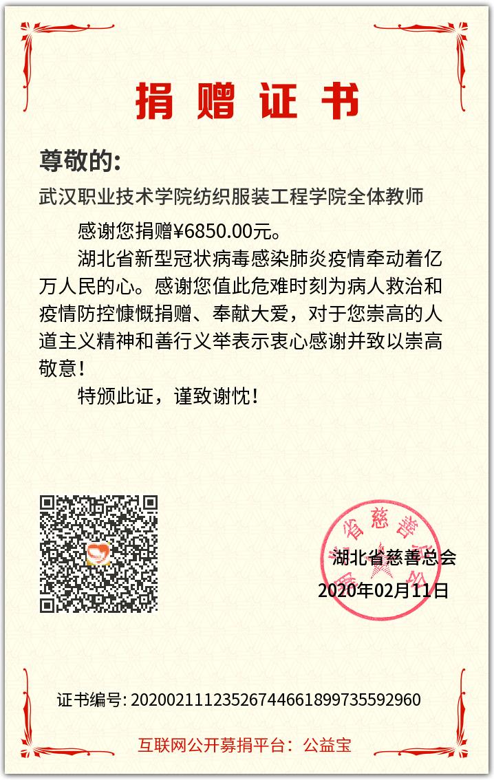 纺织服装工程学院师生捐款证书