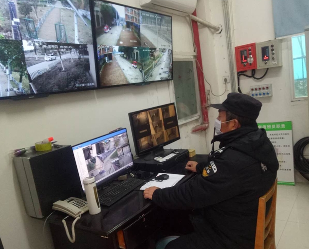 物业安保人员在监控室值守