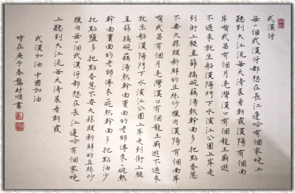 书法作品《武汉,我们在一起》(机电18302班 龚财顺)