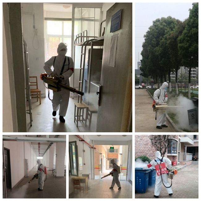 4月4日上午9时许,44名身着防护服的专业防化人员分成三小组,在园区内分2批次有序开展消杀作业。一时间,机器轰鸣,药雾弥漫。操作手背负药液箱,手持弥雾机,找准垃圾桶、垃圾站、清运车、卫生间、值班室、教室桌椅、实训室、门把手、栏杆、楼梯扶手等易感地带与部位,连喷带拭,四面用药,除垢灭菌,彻底消除病毒孳生、潜藏的土壤,净化园区工作生活环境。此次消杀覆盖7万余平方米,对所有人员出入地全方位消毒,切断疫病生物传播途径,为师生返校复课营造一方净土。
