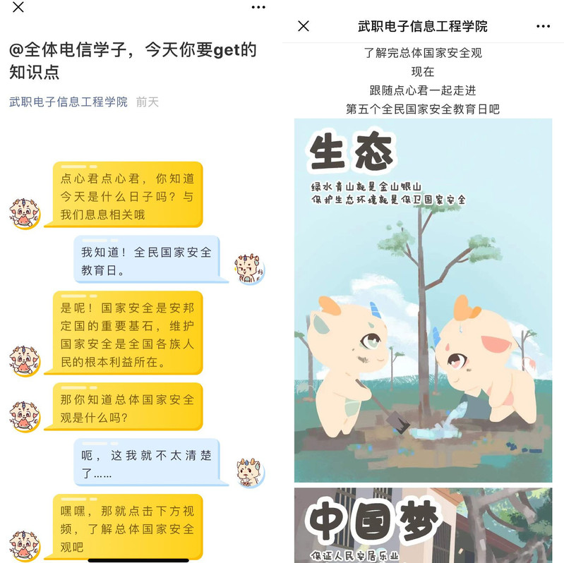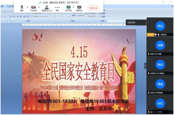 上午十点,电信学院师生准时通过网络同上一堂国家安全教育课,观看学习“总体国家安全观视觉下的疫情防控”高校公开课。电信学院18级、19级各班纷纷召开主题班会,并通过阅读电信学院官微“点心君”发布的“@全体电信学子,今天你要get的知识点”进行线上讨论学习,截至目前,推文阅读量3518次,转发量达591次,推文留言达500余条。通过系列活动引导电信学院广大学子自主学习国家安全知识,主动参与国家安全知识竞赛答题,积极向社区居民宣传国家安全观,营造了浓厚的国家安全教育氛围。