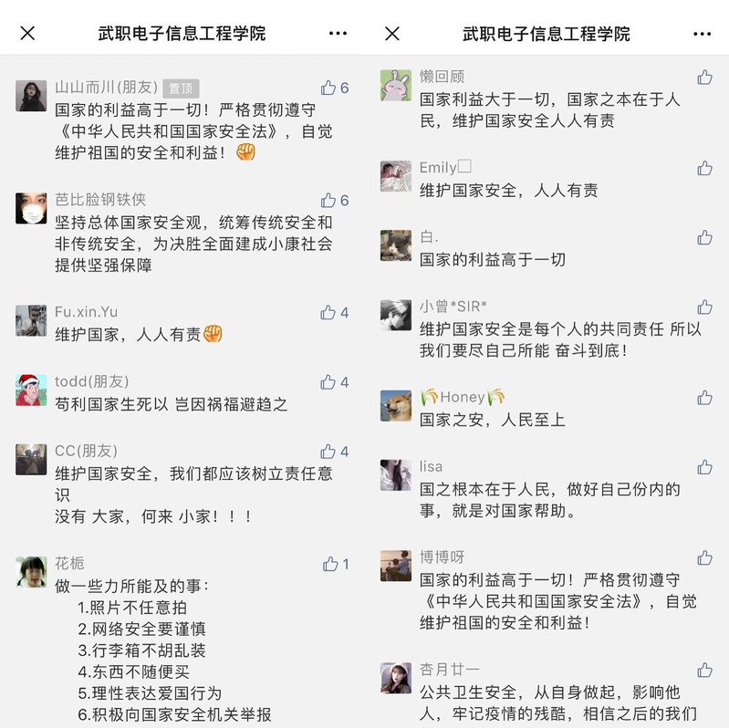 电信类19305班陈潘说:“这场疫情防控人民战争,充分彰显了党和政府把人民群众生命安全和身体健康放在第一位的立场,也让我充分认识到坚持总体国家安全观是中国共产党治国理政的经验总结,是国家安全环境新变化的必然要求,认真践行国家安全观是每个公民的应尽义务。”