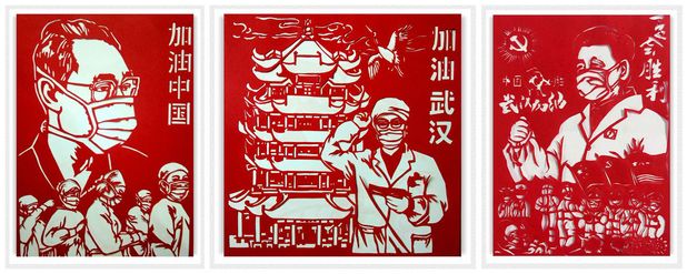 2018级邱红梅、刘雪霜、刘晓冬,2019级卢联翔、吕诗婧等社员也积极行动起来,围绕“疫情期间生活”主题,以“一起学习”“搬运赠送物资”“勤通风”“身体好”等作为题材,剪出精美作品;2019级王文慧、王长旭围绕“中国必胜、武汉必胜”主题,创作了“抗击疫情义不容辞”系列作品,表达了武职青春学子为抗疫作贡献的决心。