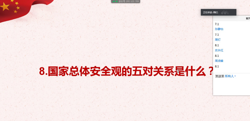 问:“国家安全工作的根本政治原则是什么?”答:“坚持中国共产党的绝对领导”;问:“24小时电话举报热线号码是多少?”答:“12339”……线上抢答环节,纺织学生党支部师生党员积极踊跃,争相作答,气氛热烈,组织有序。支部师生党员在答题过程中巩固和检验了“国家安全知识”学习效果,增强了国家安全意识。