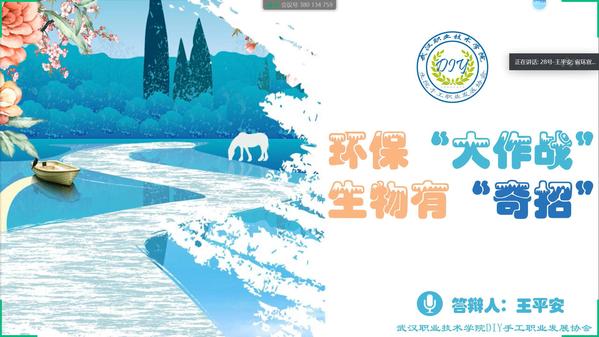 《环保“大作战”,生物有“奇招”》项目是由陈智会老师指导,制药18302班王平安、制药18303班李正红等4名DIY手工职业发展协会团队成员共同策划并参与设计的。该项目设计主要分两个环节,一是借助新媒体平台如抖音、B站、朋友圈等,多维开展以“生物大讲堂”、“环保知识科普”为主题的环保微宣教;二是立足生物专业,发挥专业特色,组织学生开展“环保实验室”、“变废为宝--DIY环保创意作品”、“社区空气质量检测”、“水污染调研”等为主题的环保实践活动。在活动探索中,使青年学生深入理解美丽中国生态文明建设的重要性和紧迫性,进一步提高环保意识,为生态环保勇担青年责任,争当环保卫士。