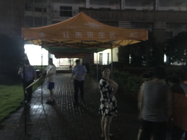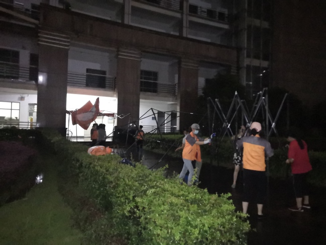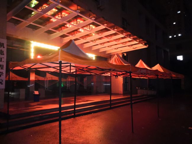 21:47分,消失了一个小时左右的保卫处处长李永林再次在群里发言了。一句“重新架起来了”让大家松了一口气。原来,计算机技术与软件工程学院院长杨旭东找来了10顶新帐篷,保卫处和后勤中心的工作人员抓紧时间把帐篷架设了起来,加上前期被风吹散但还未垮掉的帐篷,计算机类考点前的帐篷全部架设一新,校门口测温通道的帐篷也全部架设一新。