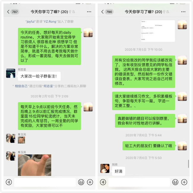 4月专升本报名结束后,陈老师单独组建专升本备考学习交流群,要求学生每天在群里打卡,比一比各自的学习时长和状态,同时推送高考考生作息时间表,要求群内考生对标自律。从此,群里形成了一股比学赶超的学习劲头。经过半年努力,超七成的专升本考生被心仪的学校录取。