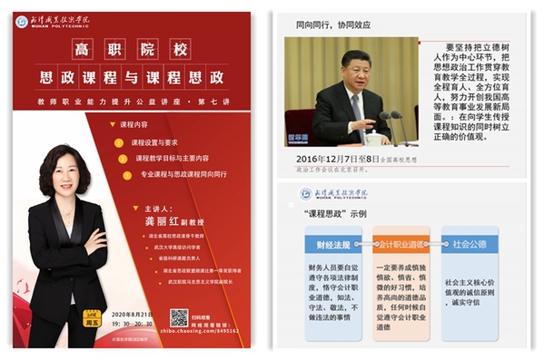 武职网讯(通讯员 王丽)8月22日晚,由学校人事处(教师发展中心)主办的“2020年教师职业能力提升”系列讲座第七讲时隔一月后再次云端开播。马克思主义学院副院长龚丽红副教授以《高职院校思政课程与课程思政》为题,通过超星直播平台与教师们分享如何将思政与课程有机融合。