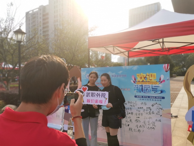 新生正式报到第一天,一名新生求助穿着红马甲的志愿者学长武乐心,不是问路,而是请他给自己和父母留张影。接着,越来越多的家长和萌新找到武乐心,留下梦园武职的第一张合影。
