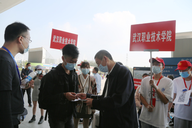 武汉职业技术学院党委书记、校长李洪渠在武汉火车站迎接新生