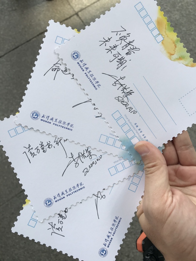 来自湖北宜昌的崔陈浩,也是独自一人前来报到。“完全没想到啊!”说起一出火车站就遇到校长来接站的事,崔陈浩难掩兴奋。他第一时间在同学群里发了这个消息,“让我的朋友们羡慕羡慕我!”原来,崔晨浩有好几个好朋友都在武汉职业技术学院就读,他正是在好朋友的强烈建议下,选择就读武汉职业技术学院计算机网络技术专业。崔陈浩说,之前自己看过学校的宣传片,“认识”校长,所以今天一眼就认出了校长。“但是,我没想到校长主动上前帮我提行李,还和我握手,那么亲切那么和蔼,这事儿必须得和朋友们炫耀炫耀!”崔陈浩说。他还展示了李洪渠送给自己的校园风光明信片,上面手写着:未来可期,不负韶华。“校长给我们每个人写的话都不一样呢。先定一个小目标,把字练得像校长写的那么好看!”崔陈浩吐吐舌头说。