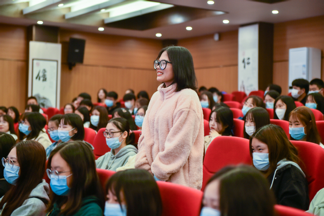 武职网讯(通讯员 丁盛)十月的武职校园秋意盎然,10月15日下午,凌峰楼C11、C21两个报告厅内气氛热烈,外语外贸学院分党委组织的新生入党启蒙教育活动在此举行。该院学生党员代表、教师党员代表、学生入党积极分子代表用三个真实而鲜活的故事,引领2020级348名外语外贸学子开启青春成长新航程。