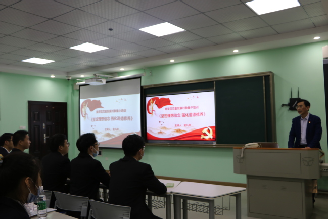 武职网讯(通讯员 沈易佳 摄影 陈俞安)10月22日中午,商学院44名发展对象齐聚逸夫楼115室,参加入党前的最后一次集中培训,聆听商学院院长孟凡中主讲的 “坚定理想信念 强化道德修养”专题党课。