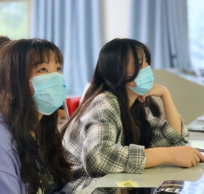 在讨论交流环节,两名美籍教师就大家提出的“美国人是如何看待新冠疫情的?”“你更愿意在中国还是你的家乡工作?”等问题作耐心解答。