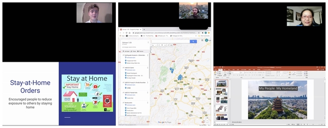 美籍教师 Caleb Overton (左)、 Zee Rock(中)和外语外贸学院教师彭春萍云端讲述“我和我的家乡”