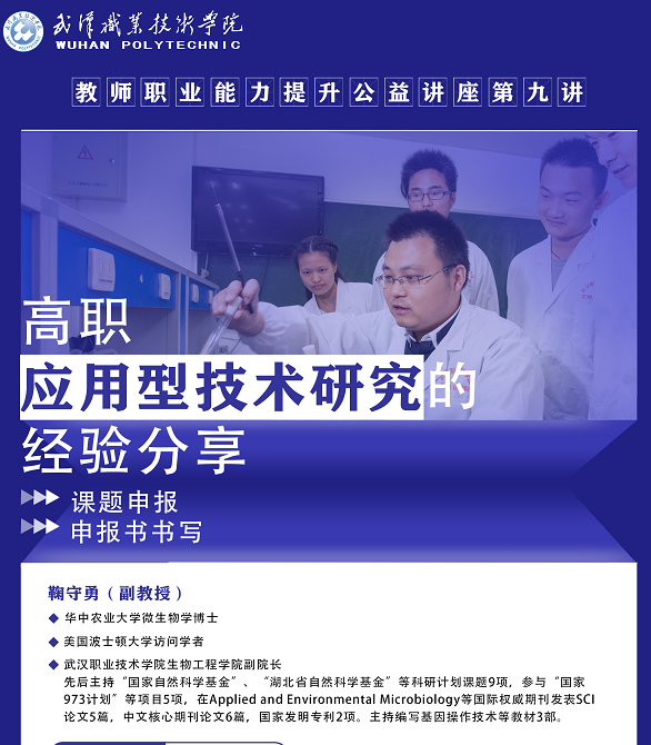 武职网讯(通讯员 王丽)10月16日晚,由学校人事处(教师发展中心)主办的“2020年教师职业能力提升”系列讲座第九讲按计划开播。生物工程学院副院长鞠守勇博士以《高职应用型技术研究的经验分享》为题,通过超星直播平台与教师们分享了课题申报与申报书撰写的成功案例和经验。