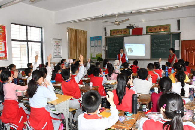 座谈会结束后,韩笑、徐梦玲、杨珍和王李杰密切配合,为张铁小学四年级两个班的学生进行公益教学。授课过程中,4名学生凭借扎实的专业素养,结合自身特点,发挥专业优势,上了一堂精彩的英语课。