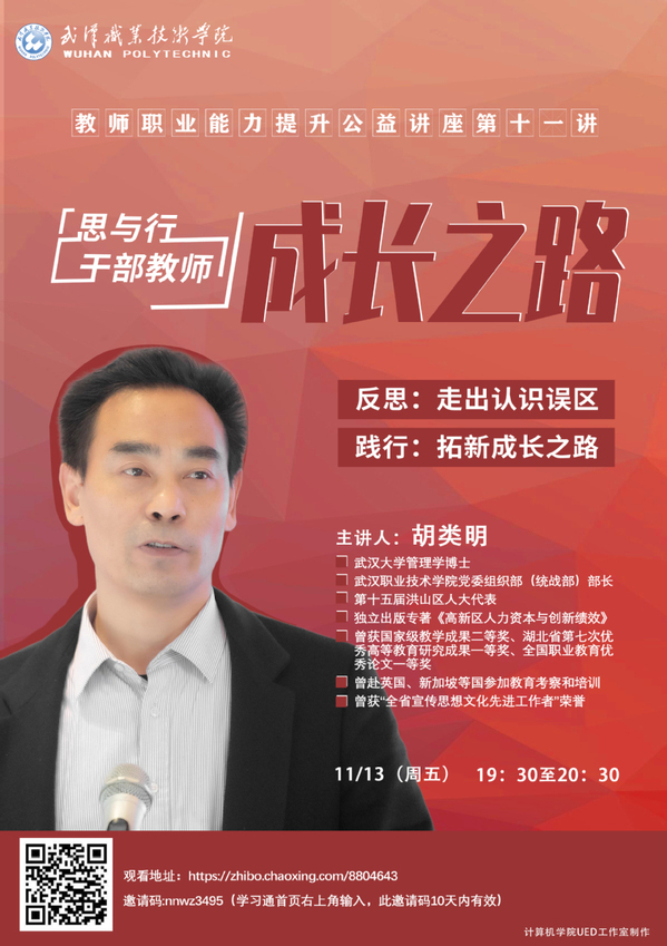 武职网讯(通迅员 王丽) 11月14日晚,学校人力资源处(党委教师工作部)主办的“2020年教师职业能力提升”系列讲座第十一讲通过“超星直播课堂”开播。党委组织部(统战部)部长胡类明博士以《思与行——干部教师成长之路》为题,给全校教职工带来一场有高度、有角度、有温度的职业发展体悟分享。