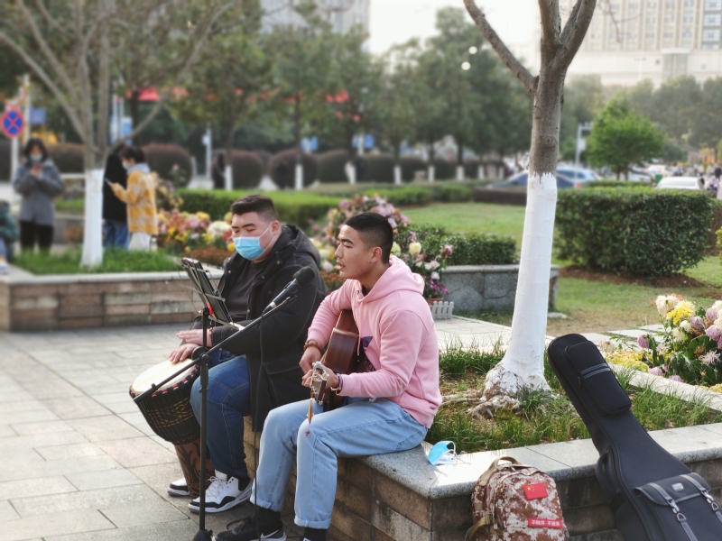 吉他弹唱、敲鼓配乐,迎新现场传来的美妙音乐声引人驻足,原来是2020级扩招新生蔡宏亮用音乐开启了大学生活。