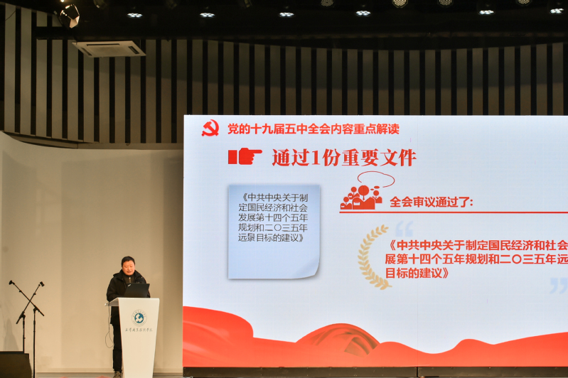 12月8日晚,纺织与服装工程学院分党委副书记全建业在凌曦楼服装表演厅作《学习党的第十九届五中全会精神》专题讲座,该院全体团学骨干、班级骨干及入党积极分子200余人到场聆听报告。