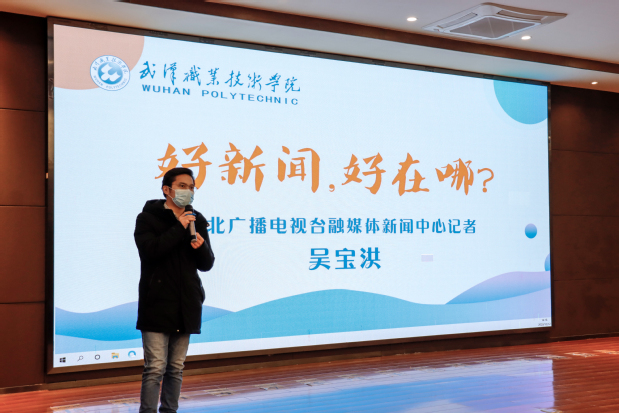 武职网讯(党委宣传部 董豆豆 大学生记者团 文倩 方雨婷 高超 周易)12月12日,武汉职业技术学院2020年度第二期通讯员新闻业务培训会在凌峰楼C11举行,湖北广播电视台融媒体新闻中心记者吴宝洪作专题讲座。本次培训由党委宣传部主办,学校各部门、二级学院教职工通讯员及学生记者近200人参会。
