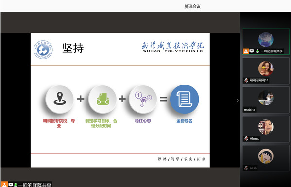 交流会上,聂永清副教授从专升本的意义、常见误区、政策变化趋势、院校和专业选择等方面作分析讲解。王梓俊从“流程、选择、复习”三个方面介绍了当初英语学习和阶段性复习的全过程,并分享了在江汉大学的学习生活情况,鼓励学弟学妹努力备考,相约江汉大学;黄雯洁分享了相关学习APP和复习资料,希望能够帮助学弟学妹提高备考效率。