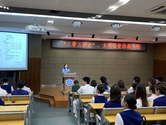 本学期以来,该院通过党史教育促进学生行动落实力,更加严格推进学生进课堂“三带三禁止”制度,即将原来口头提醒学生进课堂要带教材、带笔记本、带笔进教室,禁止带餐食、禁止抽烟、禁止穿戴不整进教学楼的要求进一步做深做实,通过检查、督办、考核机制向纵深推进。