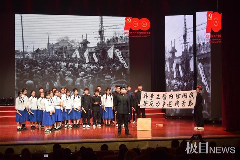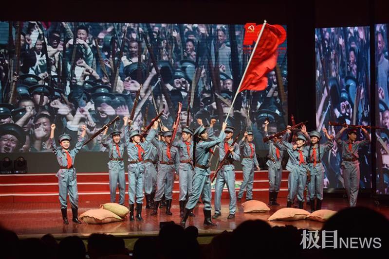 “外争主权,内除国贼!”随着身着民国学生装的学生演员走上舞台,演出拉开序幕。第一篇章《浴血寻路 开天辟地》通过五四爱国运动、八一南昌起义、知识青年奔赴延安、南泥湾大生产运动等场景演绎,学生身着中山装、学生装、八路军服装展示了中国共产党人带领中华民族和中国人民取得救亡图存伟大胜利的光辉历程。