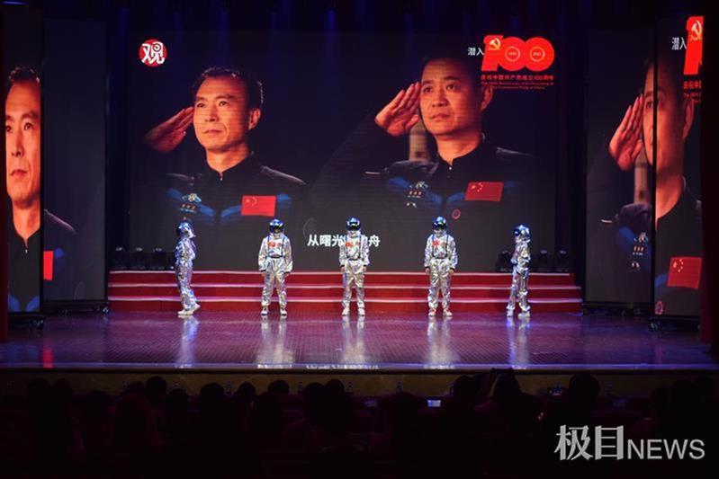 《建国立业 艰苦奋斗》篇章演绎了开国大典、社会主义建设等场景,学生演员身着陕北农民服、纺织女工服、石油工人服,赞美亿万人民为开创美好生活努力奋斗的壮志豪情,展示了党在社会主义建设初期取得的丰功伟绩。