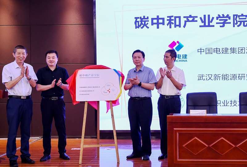 签约现场举行了武汉职业技术学院碳中和产业学院揭牌仪式,中国电建集团江西省电力建设有限公司总经理、党委副书记、董事向晓斌,武汉新能源研究院有限公司董事长杨凯,武汉职业技术学院党委书记、校长李洪渠代表校企三方现场签约,湖北省中华职教社专职副主任陈南军与三方代表共同为碳中和产业学院揭牌。