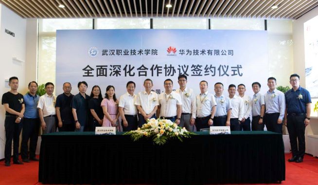 6月29日下午,武汉职业技术学院与华为技术有限公司全面深化合作签约仪式在华为武汉研究所举行。武汉职业技术学院党委书记、校长李洪渠,副校长郭沙,华为湖北政企业务部总经理孙承奎出席签约仪式。签约仪式由华为湖北政企业务部教育行业总经理闫忠辉主持。