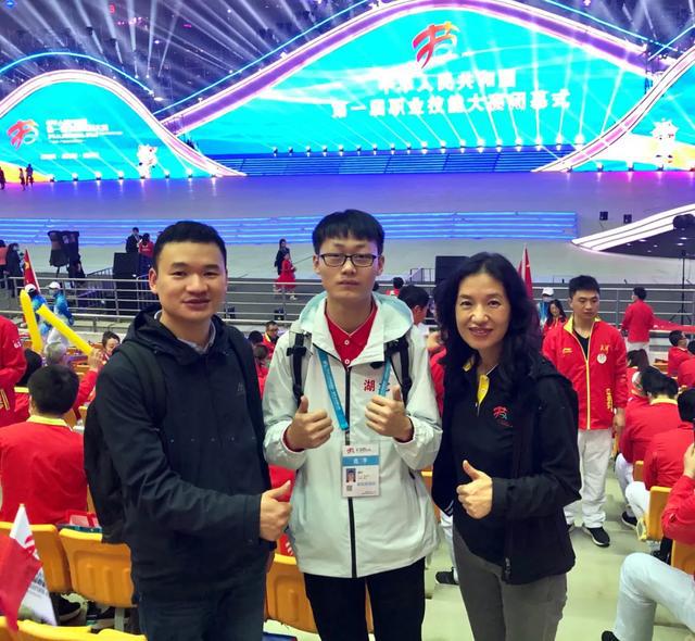 邵权(中)与指导老师朱红(右)、刘凯(左)在中华人民共和国第一届职业技能大赛闭幕式现场合影