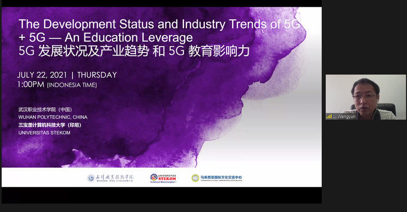 武职网讯(通讯员 罗慧中)7月22日,武汉职业技术学院与印尼三宝垄计算机科技大学(Universitas Stekom)、马来西亚国际文化交流中心联合主办的“5G发展状况及产业趋势”专题培训在“云端”顺利举行。