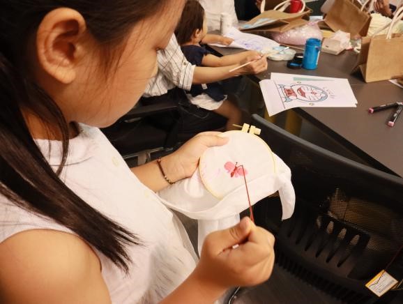 “我觉得刺绣很好玩儿,第一次体验觉得很有意思”。在时装技术项目体验区,一群小朋友安静的坐在桌前,正在体验中国传统刺绣公益项目。在老师的指导下,在空白的手帕上画上自己喜欢的图案,最后再挑选相关颜色的丝线,一针针缝纫点缀,一副艺术品就此完成。和孩子一起前来做体验绣的罗女士说,这是一个很有创意的劳动教育体验实践活动,自己从朋友圈看到活动体验征集,就报名带孩子一同前来体验,让孩子从小接受传统文化的熏陶的同时,自己也能在快节奏的生活里,静下心来绣花修身养性。