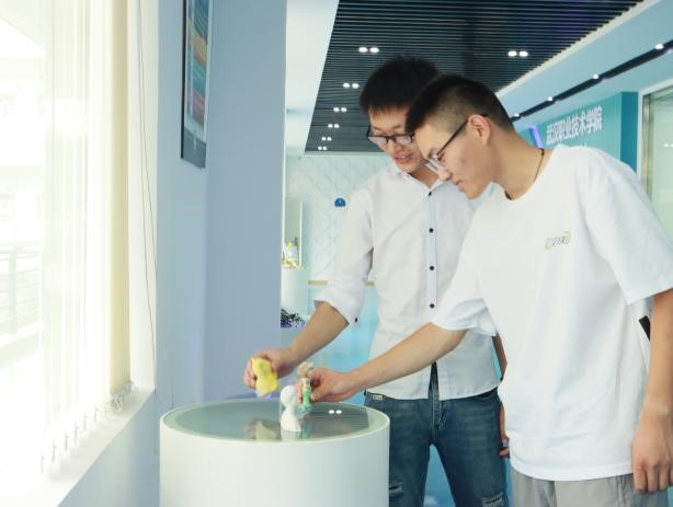 图为邵权和任同同讨论3D打印作品和打印机操作原理