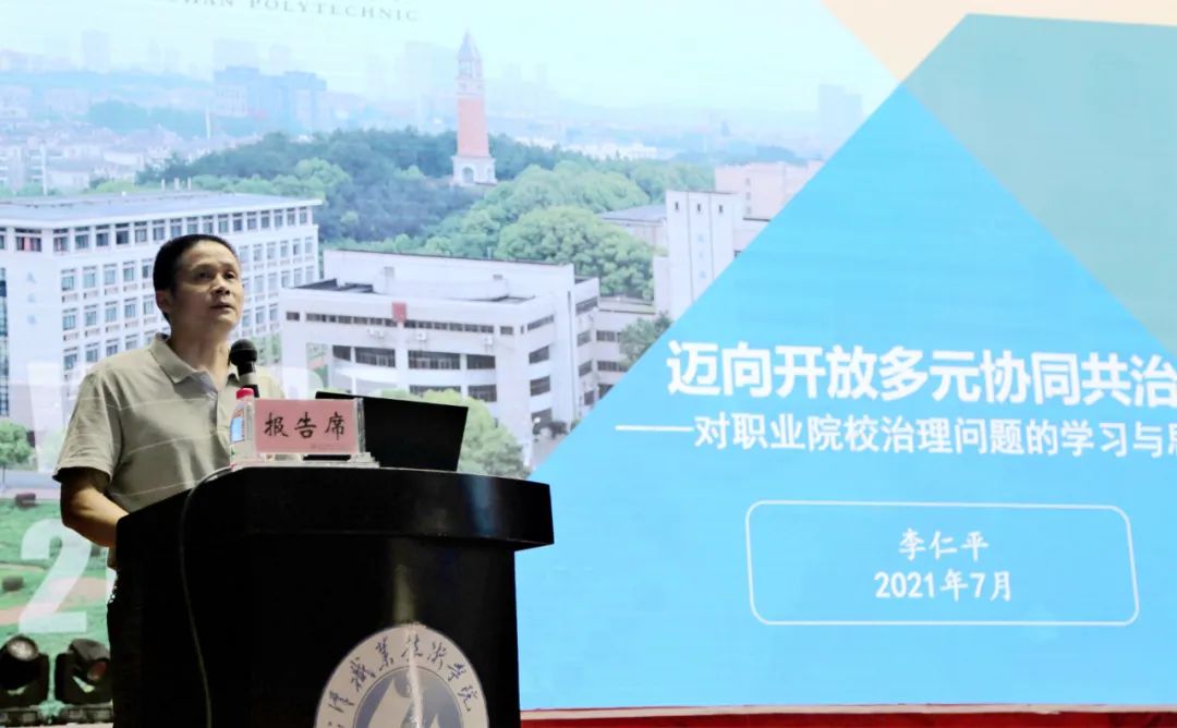 24日下午,武汉职业技术学院办公室主任李仁平作题为《迈向开放多元协同共治——对职业院校治理问题的学习与思考》的报告。报告剖析了学校在办学治校过程中出现的问题及成因,并提出了解决问题的相关路径和思考。