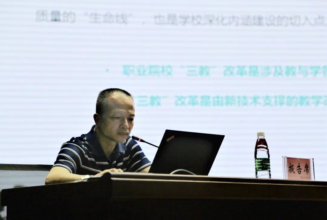 武汉职业技术学院教务处处长席波作《聚焦“三教”改革, 强化内涵建设》主题报告。报告阐述了“三教”改革的内容和意义,介绍了“三教”改革的政策导向,并结合学校实际,阐释了学校“三教”改革方法、路径以及行动计划。