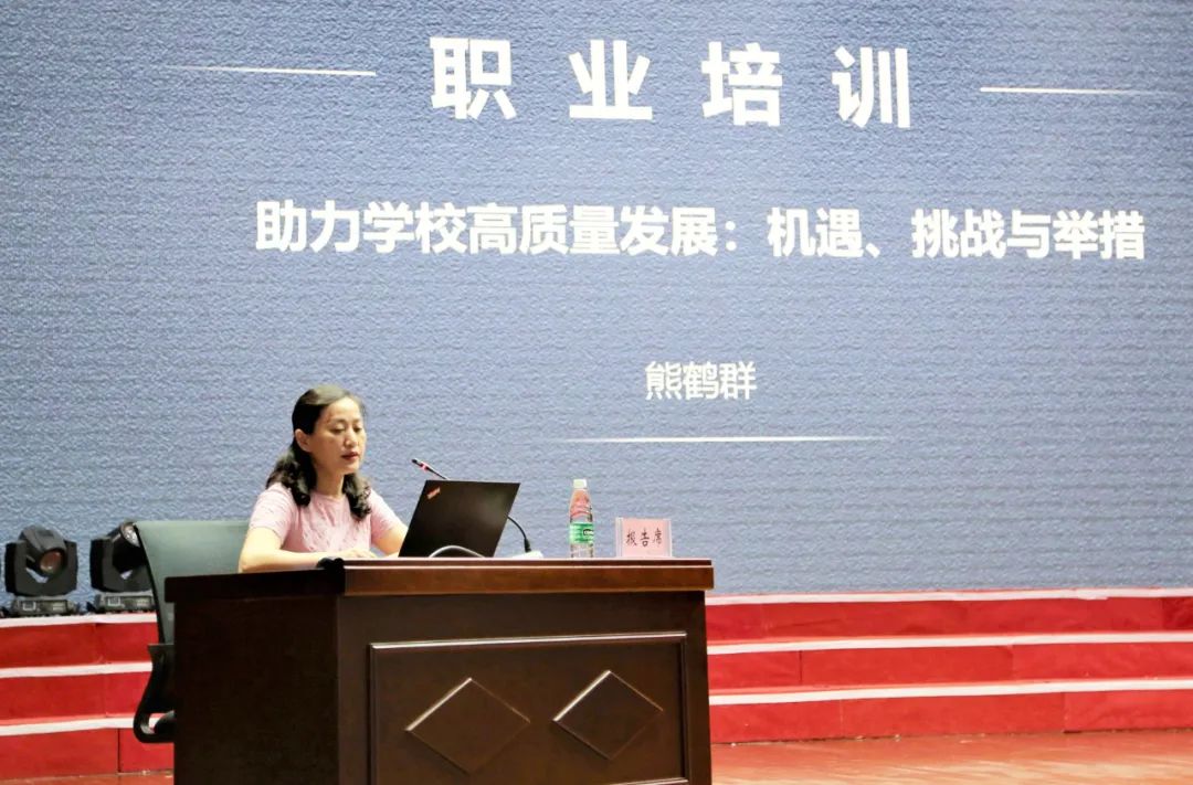 武汉职业技术学院继续教育与培训处处长熊鹤群作题为《职业培训助力学校高质量发展:价值、内容与举措》的报告。报告通报了本学期学校培训工作情况,并结合国家宏观政策分析了新形势下学校职业培训工作面临的机遇和挑战,提出了提高思想认识、明确目标任务、构建管理网络、拓展培训功能、提高培训质量、完善激励机制等六大举措。