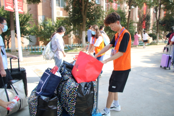 营销20301班的入党积极分子黄子龙,一大早就来到了迎新现场,做好准备工作,迎接凌家山的小主人们。“由于疫情防控要求,新生父母只能在校门前目送孩子进入校园,所以我们更要做好新生引导和行李搬运服务,让他们感受到武职的温暖。”他说,“希望大家在大学生活中能不忘初心,方得始终,开启大学生活的同时,更要好好学习,积累更多的经验和知识。”
