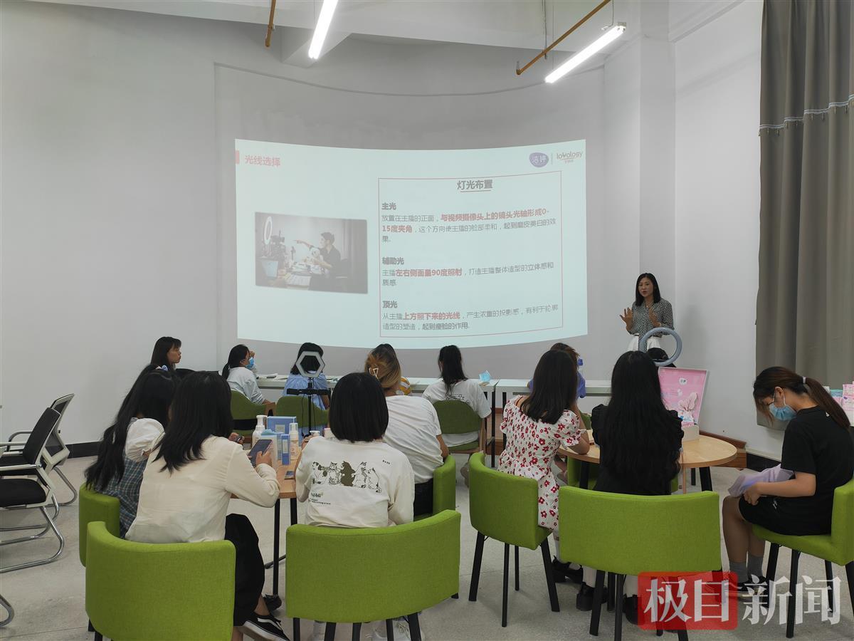 “大家点一下左上角关注,领到10元优惠券,到手价49.9……”11月26日下午,在武汉光谷APP广场的一处写字楼里,主播吕洁仪正对着摄像机推销一款来自湖南湘西的莓茶。这是她今年从高职毕业后的第一份正式工作,“我学的是国际经济与贸易专业,受疫情影响,本专业的工作不太好找,在招聘会上发现主播岗位工资待遇不错,就来挑战一下。”