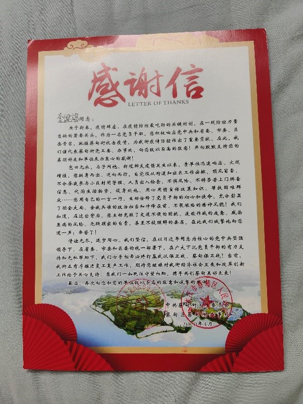 武汉市蔡甸区人民政府向李健雄发来感谢信