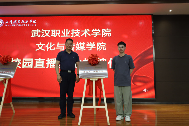 揭牌仪式环节,副校长郭沙分别与云尚产业发展集团、中联集团教育科技有限公司领导为校企共建的直播人才孵化基地和直播实训基地揭牌。