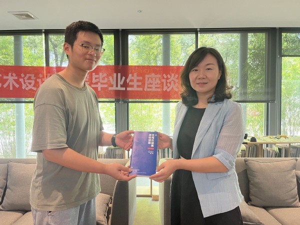 谢丽向毕业生代表郭童赠送《优秀项目作品集》