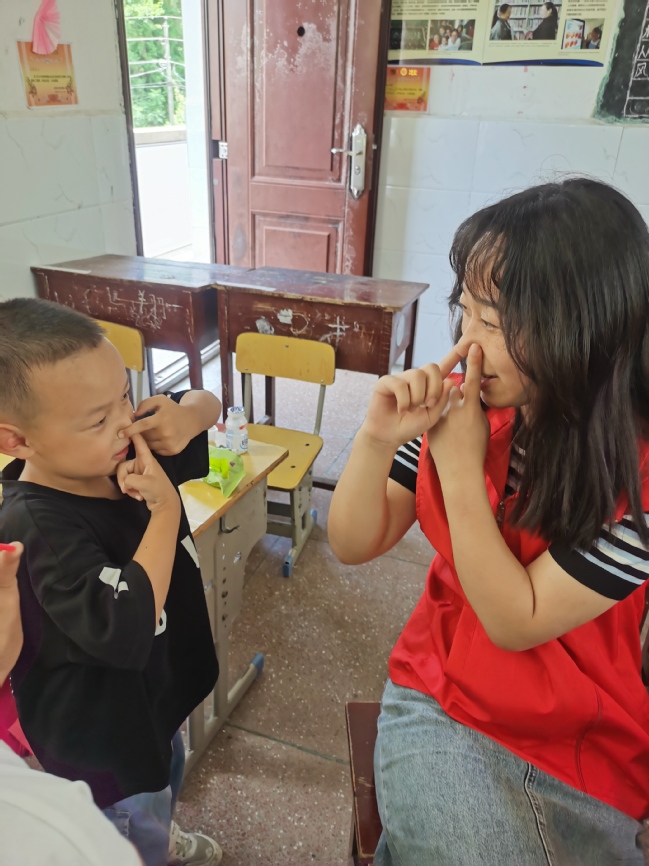 短短几天,队员们就跟当地的孩子们建立起了深深的情谊。队员喻丝璐深受孩子们的欢迎,经常被几双小手牢牢抓住,听着此起彼伏的“姐姐”呼声,她既略羞涩又开心。她说:“有一次,我送一个小朋友去上厕所,临到厕所门口,她牢牢抓着我的手不松,要我千万不要走开,一定要等她出来。那一刻我才知道,原来她是如此的依赖我。”
