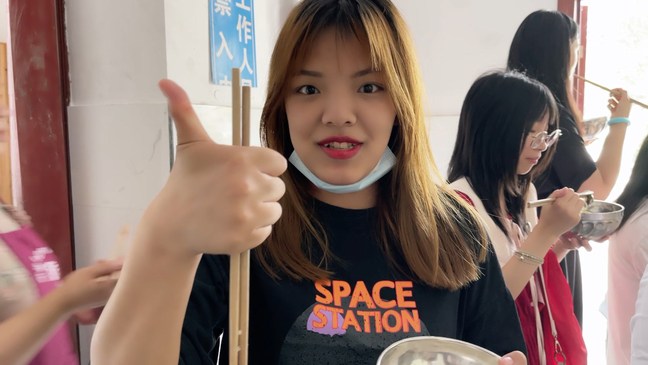 队员曾心及其他队员一起吃工作餐