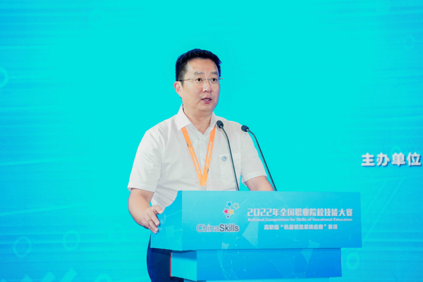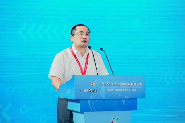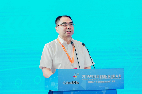 武汉职业技术学院校长鄢烈洲致辞。他代表学校全体师生向给予大赛热忱关心与精心指导的各级领导表示崇高的敬意,向各参赛单位、参赛选手、指导老师、监督仲裁员、裁判员、专家组成员表示衷心的感谢,向在大赛中取得优异成绩的各位选手表示热烈的祝贺。他表示,学校一定会以承办本次大赛为契机,认真总结经验,积极向兄弟院校学习,向各位专家讨教,把大赛资源和成果转化好、学习好、利用好,更好的以赛促教、以赛促学、以赛促建、以赛促改,不断提高技术技能人才培养质量,让更多的学生看到更高、更远、更广阔的世界,拥有更多元的发展路径和出彩的人生。