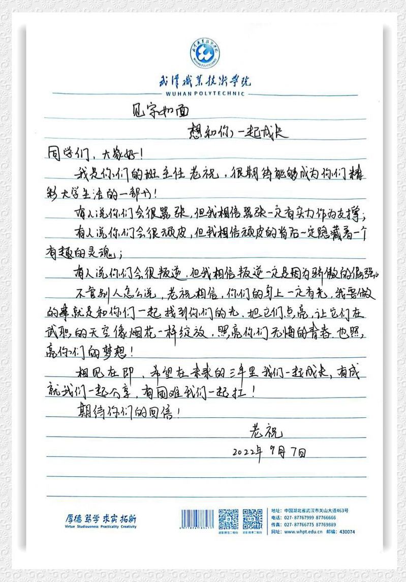 武职网讯(通讯员 严芮)当匆匆脚步在校园里停驻,当核验报到手续通过,当行囊被志愿者接过,2022级萌新就会收到这样一份《见字如晤》的信封。原来,纺织与服装工程学院辅导员、班主任为每一位新生准备了一封信和书签,期待与2022级萌新在武职校园相遇。